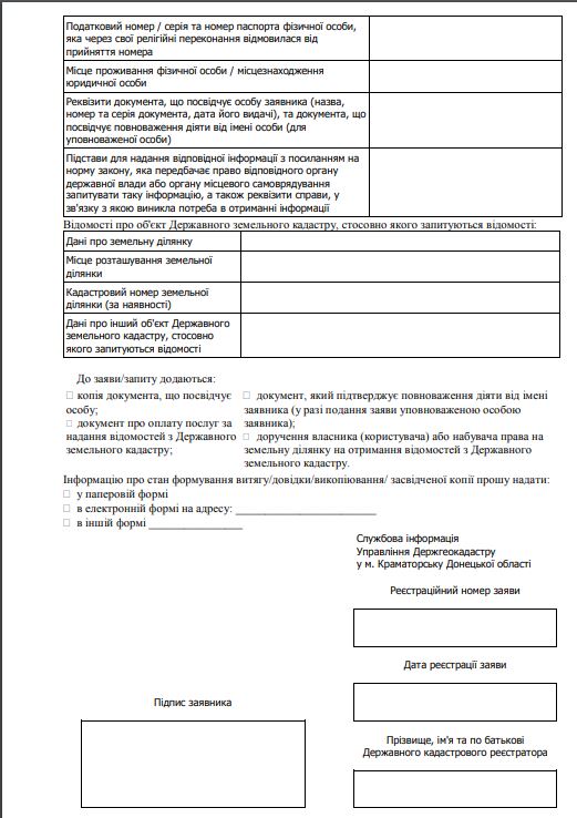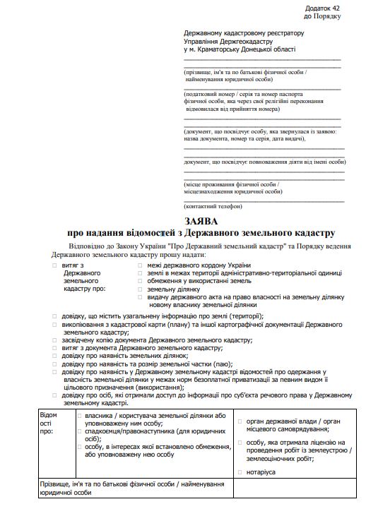 Витяг з Земельного кадастру також можна замовити та отримати через Кадастрового реєстратора та/або ЦНАП. Для цього заявник або уповноважена ним особа подає Кадастровому реєстратору, або працівнику ЦНАП лише такі документи: